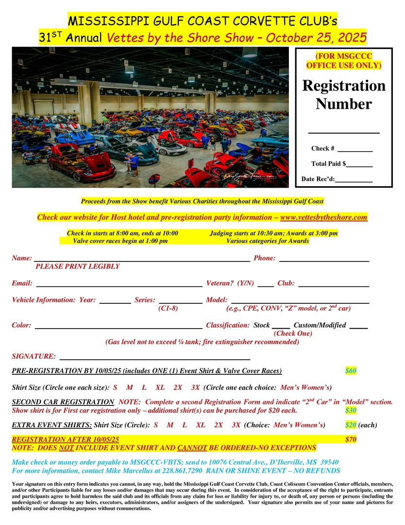 "Vettes by the Shore" Show! We've given our registration form a new look and updated our registration fee(s) so that we can continue to host our show at the Biloxi Coast Coliseum and Convention Center! We had over 140 registered cars again last year and would like to thank all who participated to make our show the success it has become! Indoor space is limited so get your registration in early to ensure an indoor spot!
